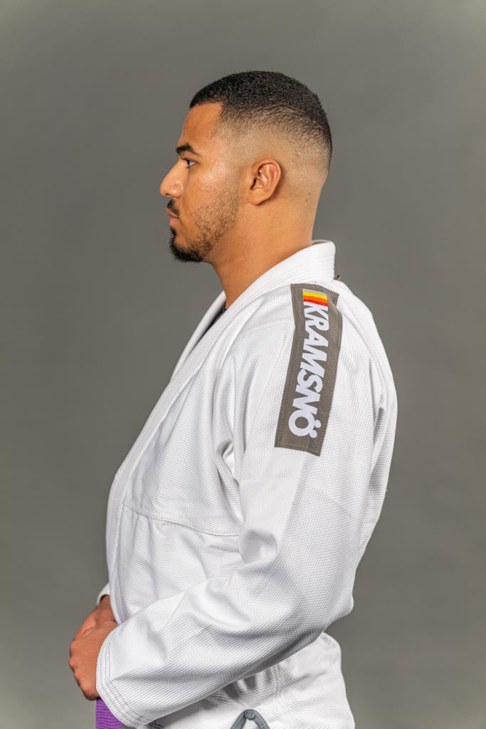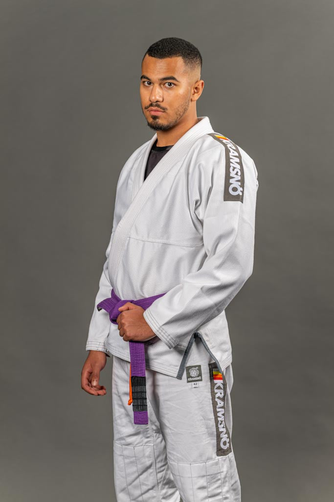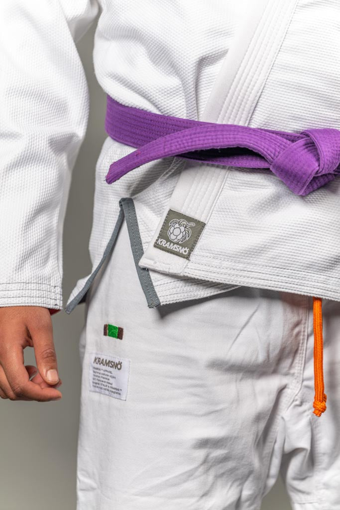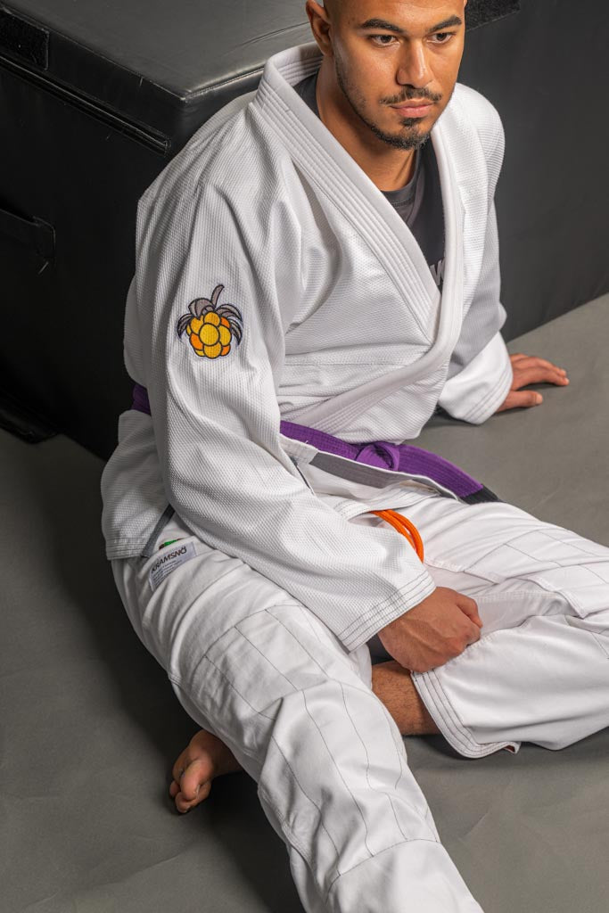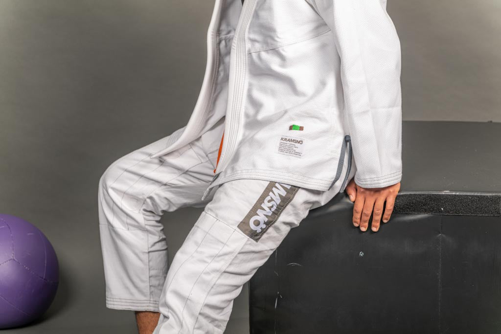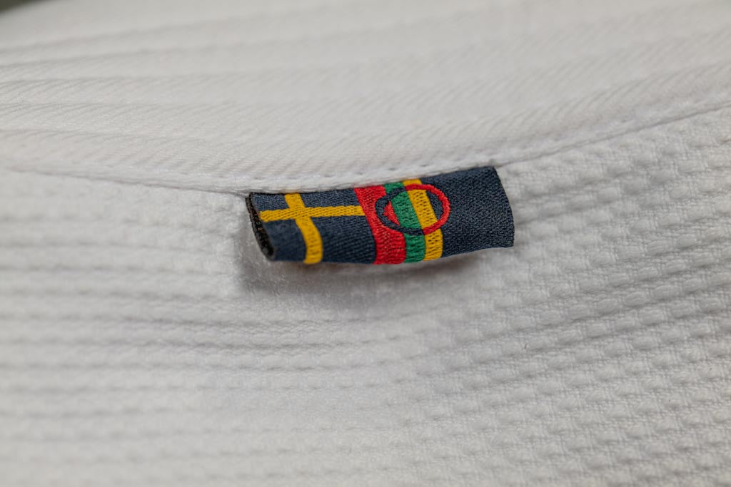 Exklusiv limiterad utgåva av kollektionen ESSENTIELL. 400 gsm Pärlväv frostvit 100% Pakistansk premium bomull. Gummerad krage för att förhindra att svett och bakterier absorberas i kragen. Byxorna är tillverkade i 100% bomull. Designad och utvecklad i stockholm, Sverige. Silver gråa axel, ben patchar och brodyr med inspiration från svensk kultur. Krympningsgraden är ca 2-7% efter fem till tio tvättar på 30 grader.